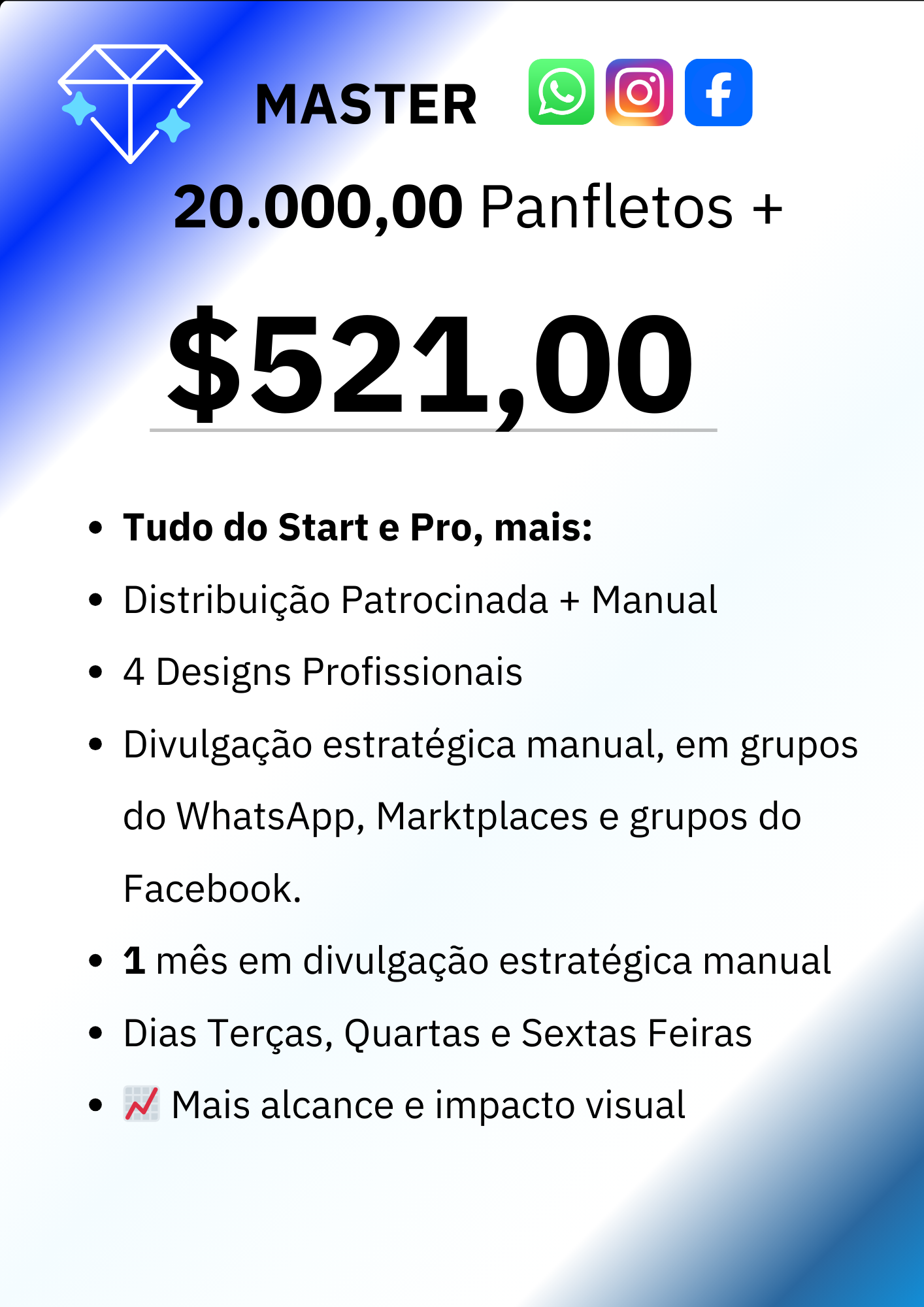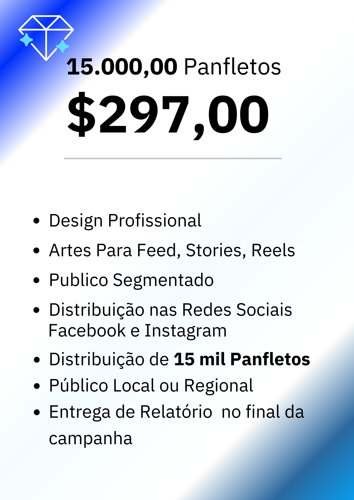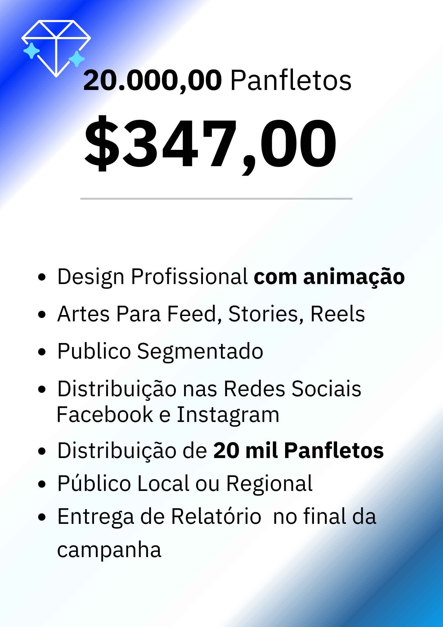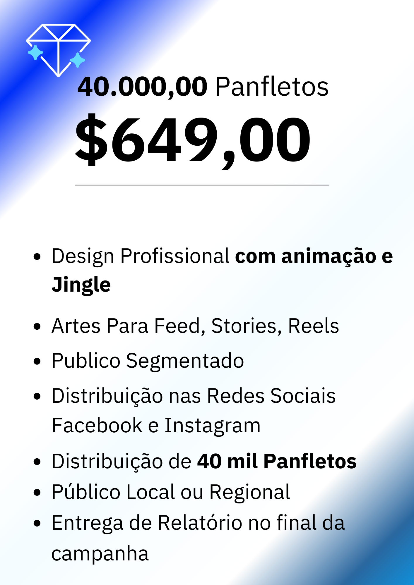 Nesta opção pode escolher a quantidade de panfletos, em quais mídias serão entregues, Facebook, Instagram,TikTok e YouTube. Se quer local, regional ou nacional. Aqui Você monta seu panfleto de acordo com a sua necessidade.